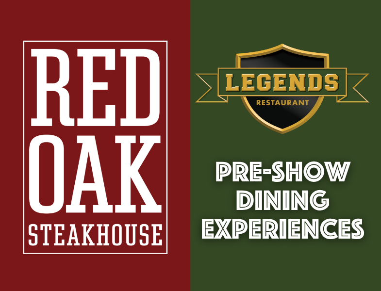 Turn your night out into a full experience. Before the lights dim, indulge in exclusive show-night menus at Red Oak Steakhouse and Legends Restaurant. Thoughtfully crafted for these special evenings, each menu pairs bold flavors and elevated selections with the excitement of live entertainment.