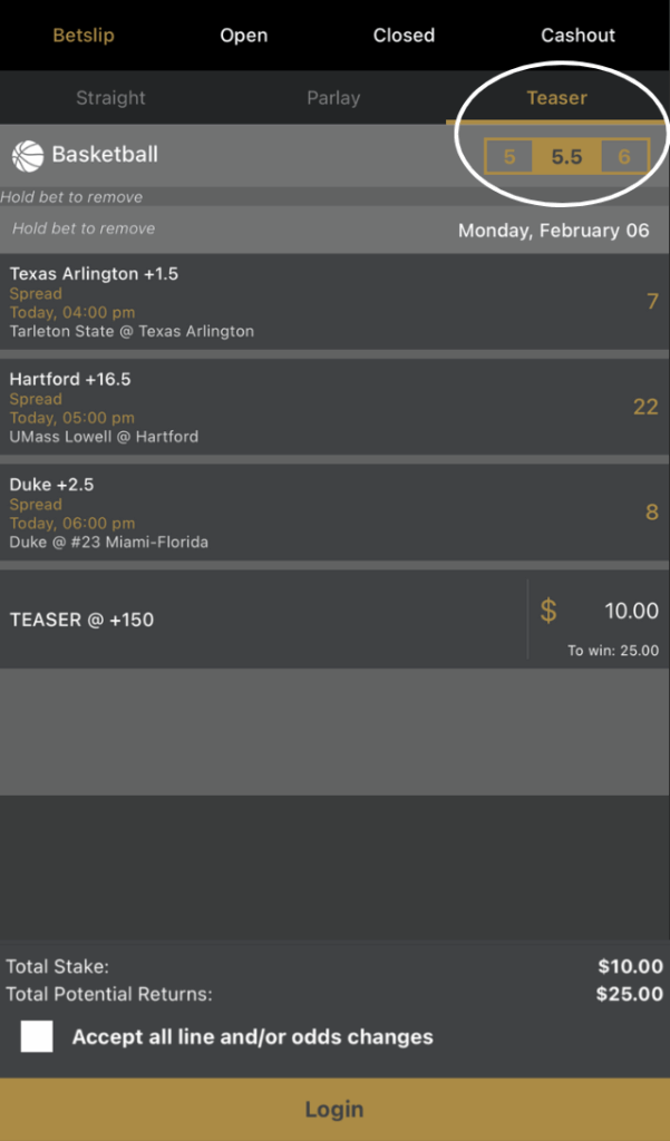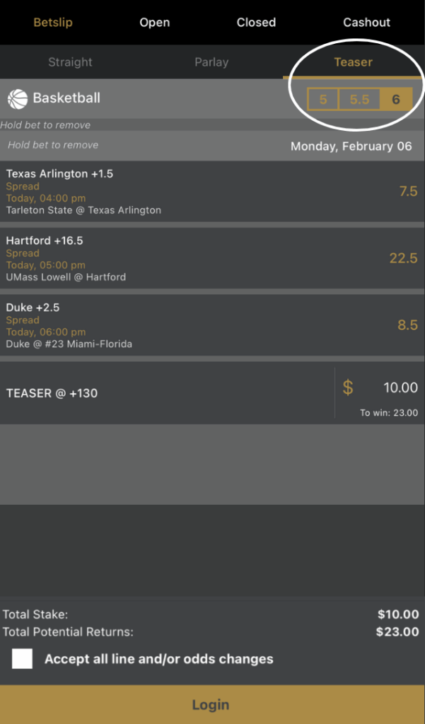 Teaser Info: For NCAAB and NBA, a user can tease points in the range of -6 to -5 (incl. half points). For two-team teasers resulting in Tie/Win, Tie/Loss, or Tie/Tie, wagers will be considered a push and wagers will be refunded.
